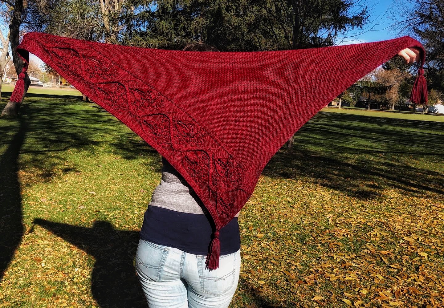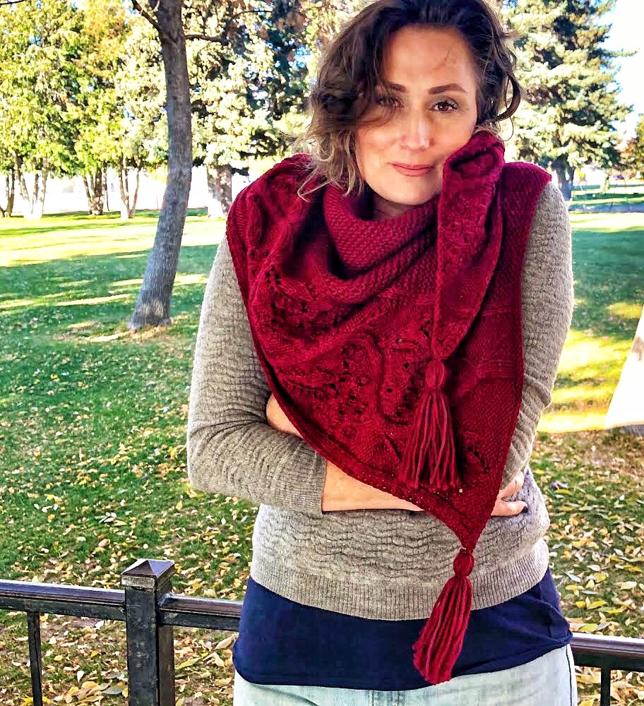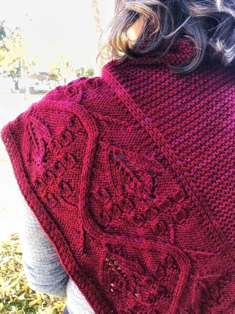 Could you use a big, squishy shawl to keep you cozy during a vineyard visit or outdoor wine tasting? Grab a glass of wine and a few skeins of Fleece Artist Chinook or your favorite yarn, think of Dionysus, and give this shawl design a try. The cable and lace motif is fairly simple once you get used to it, and it is surrounded by lots of garter stitch, making this design a perfect project for wine tasting knitting. Even better, your finished work will always remind you of a delectable glass of wine.