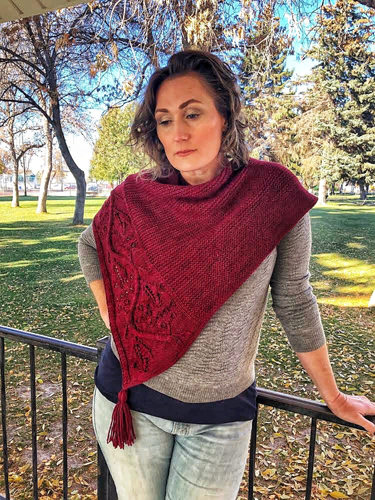 If you can’t tell, I’m a Greek mythology nerd and also a wine lover. I’ve had this shawl design brewing in my head since I started designing knitwear in 2016, but I hadn’t come across the perfect yarn to make it a reality – until I saw Fleece Artist’s Chinook base in their stunning Wine colorway, that is! I was so happy to get to knit my sample in this yarn – the color is rich and vibrant, and the yarn itself is squishy, soft, and has an excellent stitch definition.