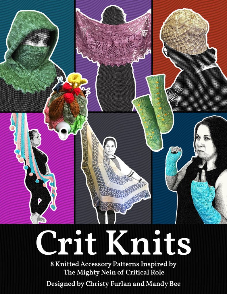 Crit Knits is a collection of 8 knitwear designs by Christy Furlan and Mandy Bee. Each of the 8 designs is inspired by a member of the Mighty Nein from Critical Role, Campaign 2 and uses stunning yarn from Critical Sheep, to layer on even more D&D fun.