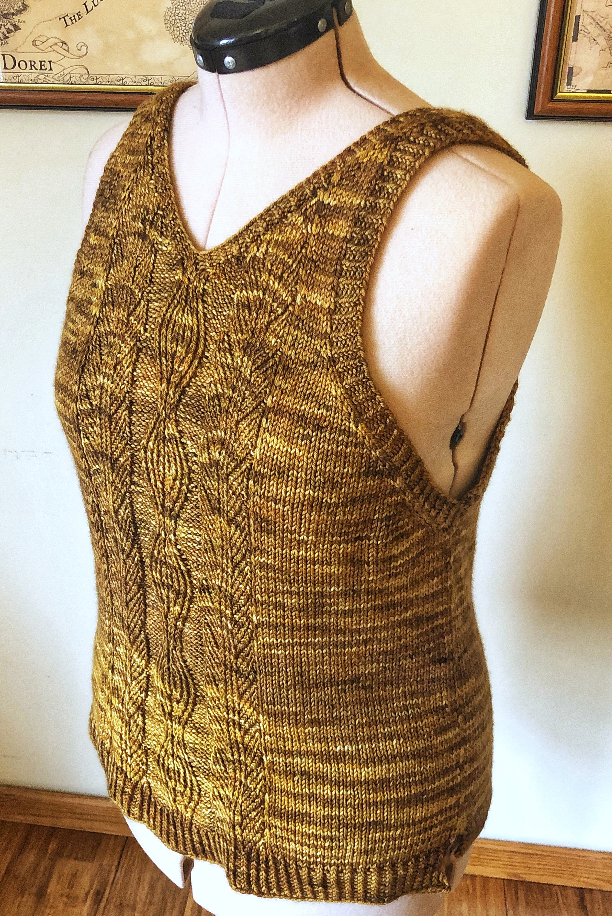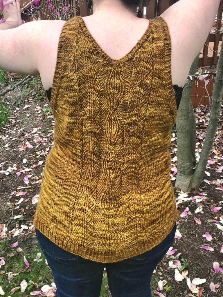To play off the history of the main stitch pattern, I went for a very modern shape for this tunic-like tank top. Meant to be worn with a pretty bralette, sports bra, or camisole, the top has low cut, deep armholes and a V neckline in the back to show off your layers. This is balanced by the long, flowy fit of the top itself and the higher square neckline in the front (though you could wear it either way, of course). To minimize seaming, this top is knit from the top down in one piece. You’ll cast on both straps at once, then work through both sides of the neckline until finally joining in the round to complete the body of the top. As you go, you’ll create “seams” along the sides of the top with slipped stitches that will eventually flow into a split hem.